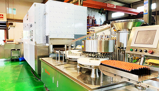 采用超聲波清洗及水氣交替沖洗、熱風循環式高溫滅菌、多頭灌裝與封口等技術。整線聯動自動控制。操作簡單方便,實現了機電一體化。