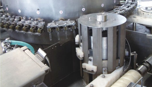 在進瓶部位與烘干機接口處設計有一個可控的緩沖區,它由一套行程控制系統和一條可伸縮的擋瓶帶組成,用來控制該區域內瓶子的數量,當該區域內瓶的數量超過設定值時,行程控制系統發出指令,可以使洗瓶機停止工作、烘干機網帶自動停止輸瓶,當該區域內的瓶子減少到設定值時,灌封機的進瓶絞龍自動停止進瓶,直至該區域瓶子恢復到正常狀態。這樣實現了整條線的聯動工作,保持前后各單機工作協調一致。