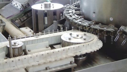 第一步由高壓的循環水沖洗瓶子的外壁,然后第一組噴針插入瓶內沖循環水(或沖壓縮空氣將瓶內循環水排出),第二組沖第二道循環水,第三組沖壓縮空氣,第四組沖注射用水,第五、六組沖壓縮空氣最大限度減少瓶內的殘留水。最后壓縮空氣吹瓶子外壁。機械手將瓶子翻回,使瓶口朝上,并由出瓶同步帶將瓶子推入烘箱或出瓶盤上,至此完成瓶子的整個清洗過程。
